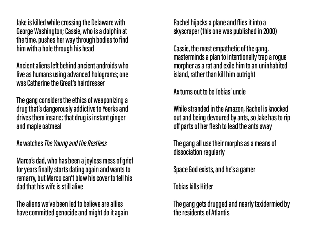 They have released the entire Animorphs series as PDFs online for free. Most of the books are short and could be read in a day or so. The standalone Chronicles books are a bit longer, and great outings that complement and tie into the main plot nicely.